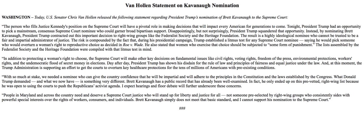 @BenCardinforMD and all Democrats will unite to oppose this clear attempt to obstruct justice. Trump should not be allowed to nominate anyone who might hear a case against him, especially Kavanaugh. - 1 more reply