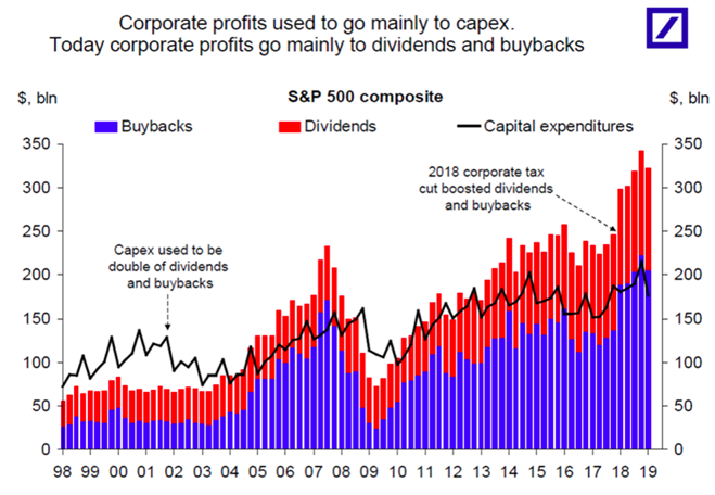 From Torsten Slok at Deutsche Bank: corporations using their profits for dividends and buybacks, not investment — hence the failure of the 2017 tax cut pic.twitter.com/WCcVeXlezq