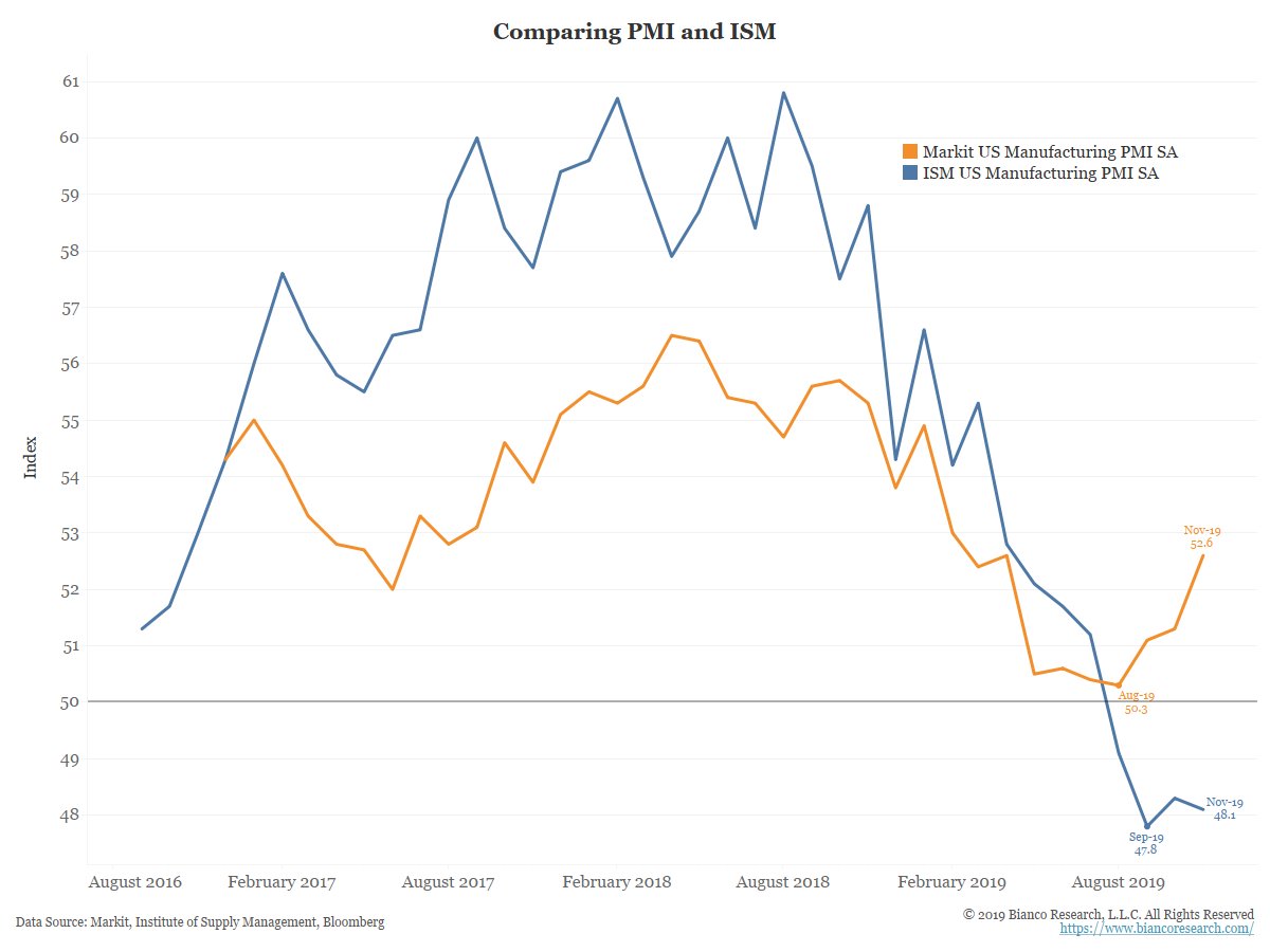 Correct about the differences between ISM and PMI. Wall Street is pointing (hard) at the PMI rebound as a leader of better things to come. However, the current PMI only started in 2016. So, this is the first meaningful divergences between the two.