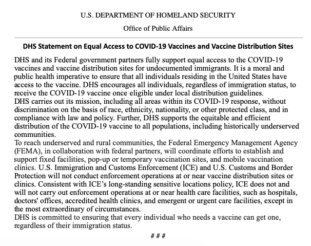 Just in: DHS says it encourages all individuals, regardless of immigration status, to get the Covid-19 vaccine and notes ICE and CBP "will not conduct enforcement operations at or near vaccine distribution sites or clinics."pic.twitter.com/4EEQuMH4as