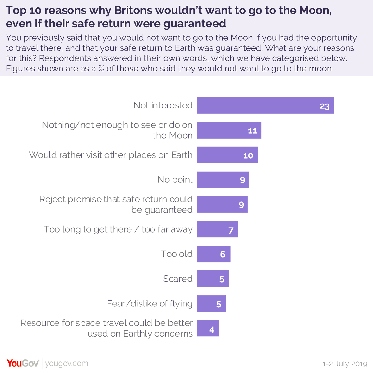 Half of Brits wouldn't want to take a trip to the moon, even if their safety were guaranteed. The top reasons: Not interested - 23% Not enough to see/do - 11% Rather visit other places on Earth - 10% "No point" - 9% Reject guaranteed safety premise - 9% https://yougov.co.uk/topics/science/articles-reports/2019/07/20/half-britons-wouldnt-want-go-moon-even-if-their-sa?utm_source=twitter&utm_medium=website_article&utm_campaign=moon …pic.twitter.com/fytX6fo9ao