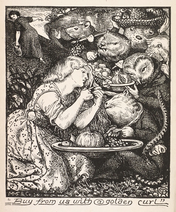 #WombatWednesday, it's one of the enthusiastic fruit-selling goblins in Christina Rossetti's poem 'Goblin Market', described as "One like a wombat prowl’d obtuse and furry" (illustrated by Dante Gabriel Rossetti). Pre-Raphaelite wombat mania info: https://bit.ly/2U6ruYE pic.twitter.com/GlG9QtxcmA