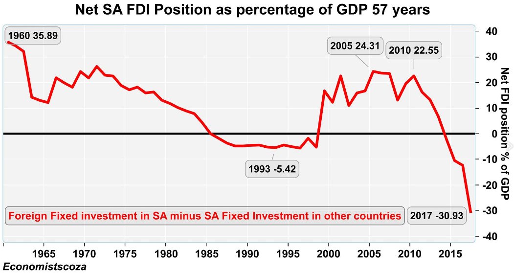 Why CR has to urgently trawl overseas for investment in SA. During the Zuma years net foreign fixed investment fell to a worse level than during the disinvestment campaign of the 1970s &80s. With a devastating impact on unemployment. Incredible chart by economist