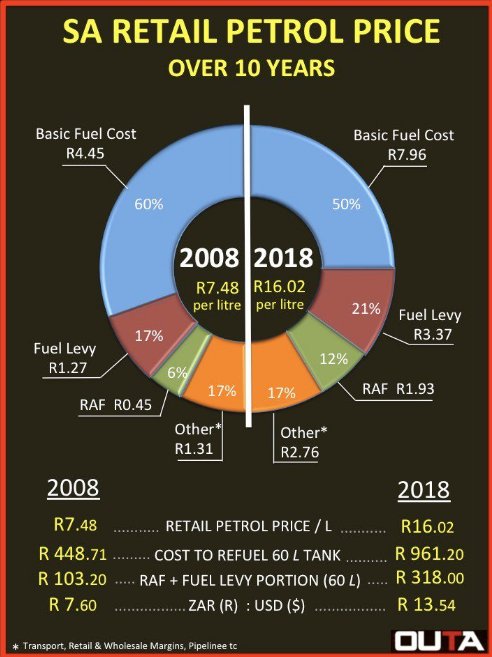A 60lt petrol tank costs R961 to fill. Of that 33% (R318) is tax - up from 23% in 2008. Fuel levy +RAF has grown by 11.9% per annum - far exceeding inflation. Clearly this is part of the cost we are paying for rampant corruption. Thanks to