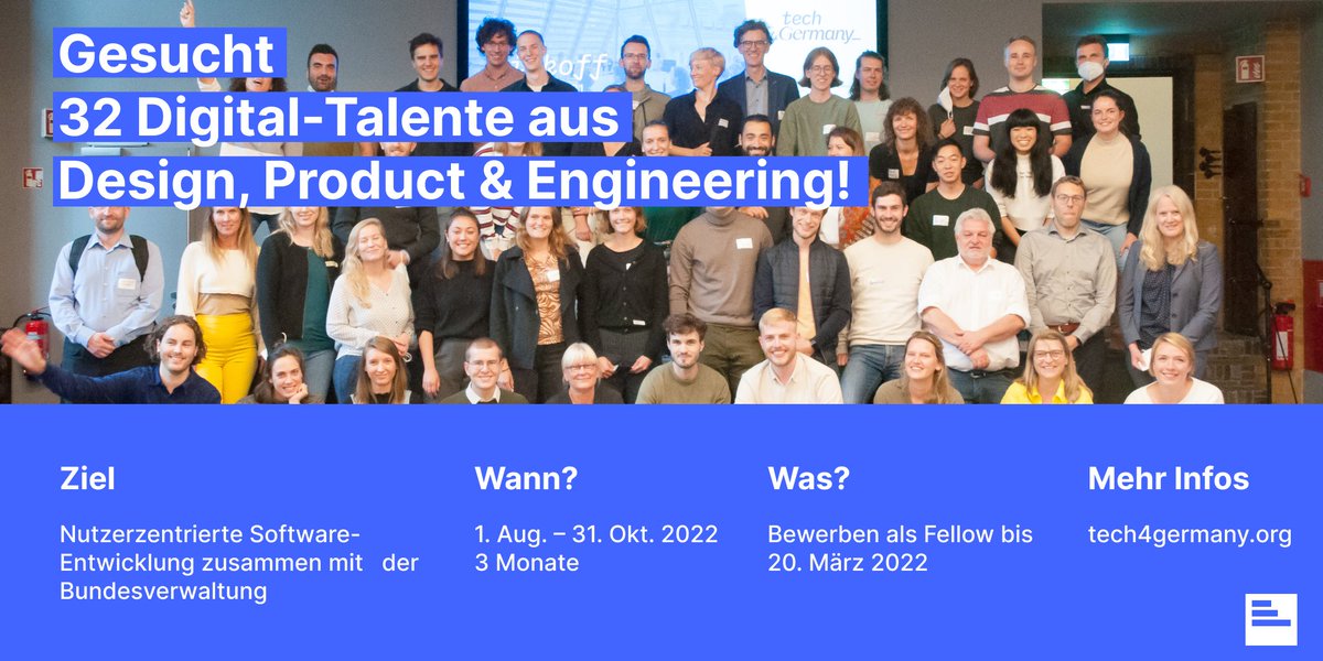 @Tech4Germany geht in die 5. Runde. Wir suchen 32 Digital-Talente aus#ProductManagement, UI/UX-#Design und#Software Engineering, die ab 01.08. für 3 Monate die#Digitalisierung der#Bundesverwaltung aktiv mitgestalten möchten. Jetzt bewerben!#T4G2022https://twitter.com/Tech4Germany/status/1490676720659275776 …