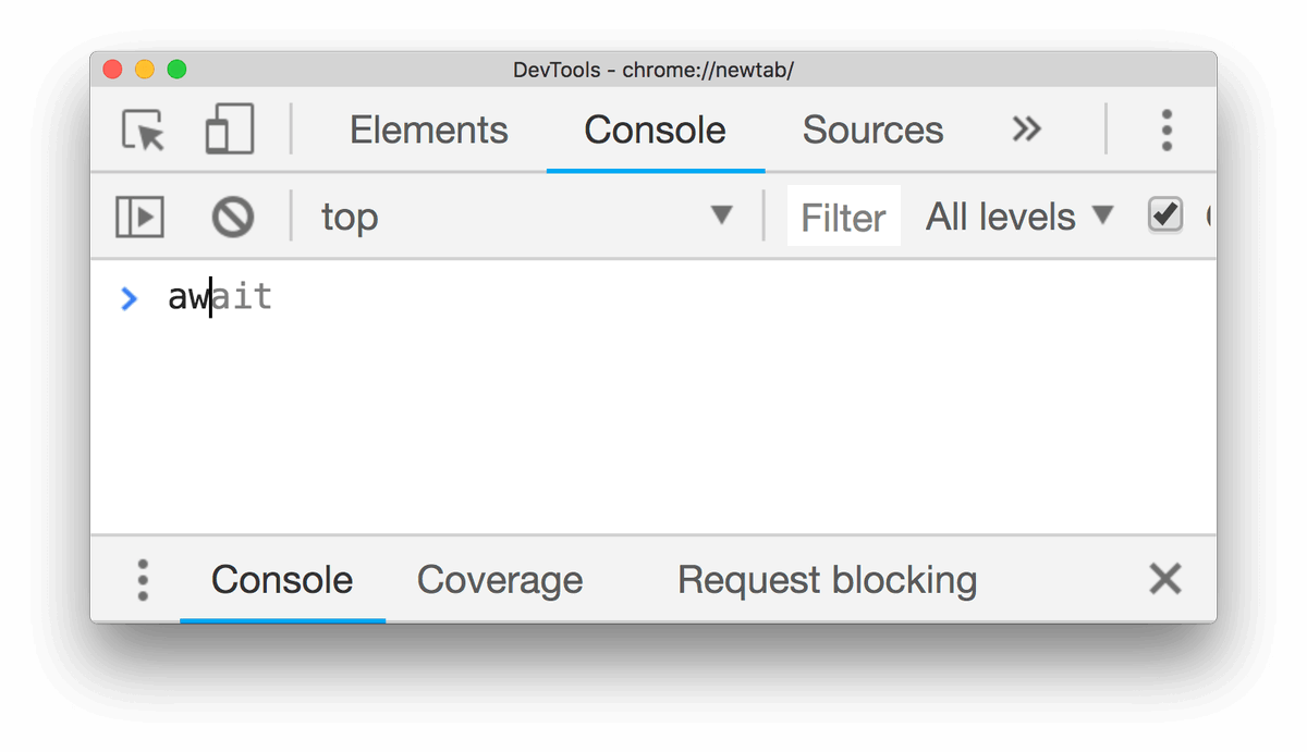 Now in Canary: ES8 keywords (like await) in the Console's autocomplete UIpic.twitter.com/AIO08IvXDR