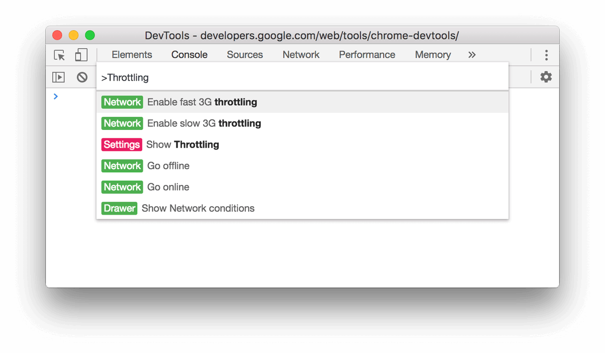 New in Chrome 70: Enable fast 3G or slow 3G throttling from the Command Menu. How to open the Command Menu: https://developers.google.com/web/tools/chrome-devtools/ui#command-menu …pic.twitter.com/9xTvHBMRDr