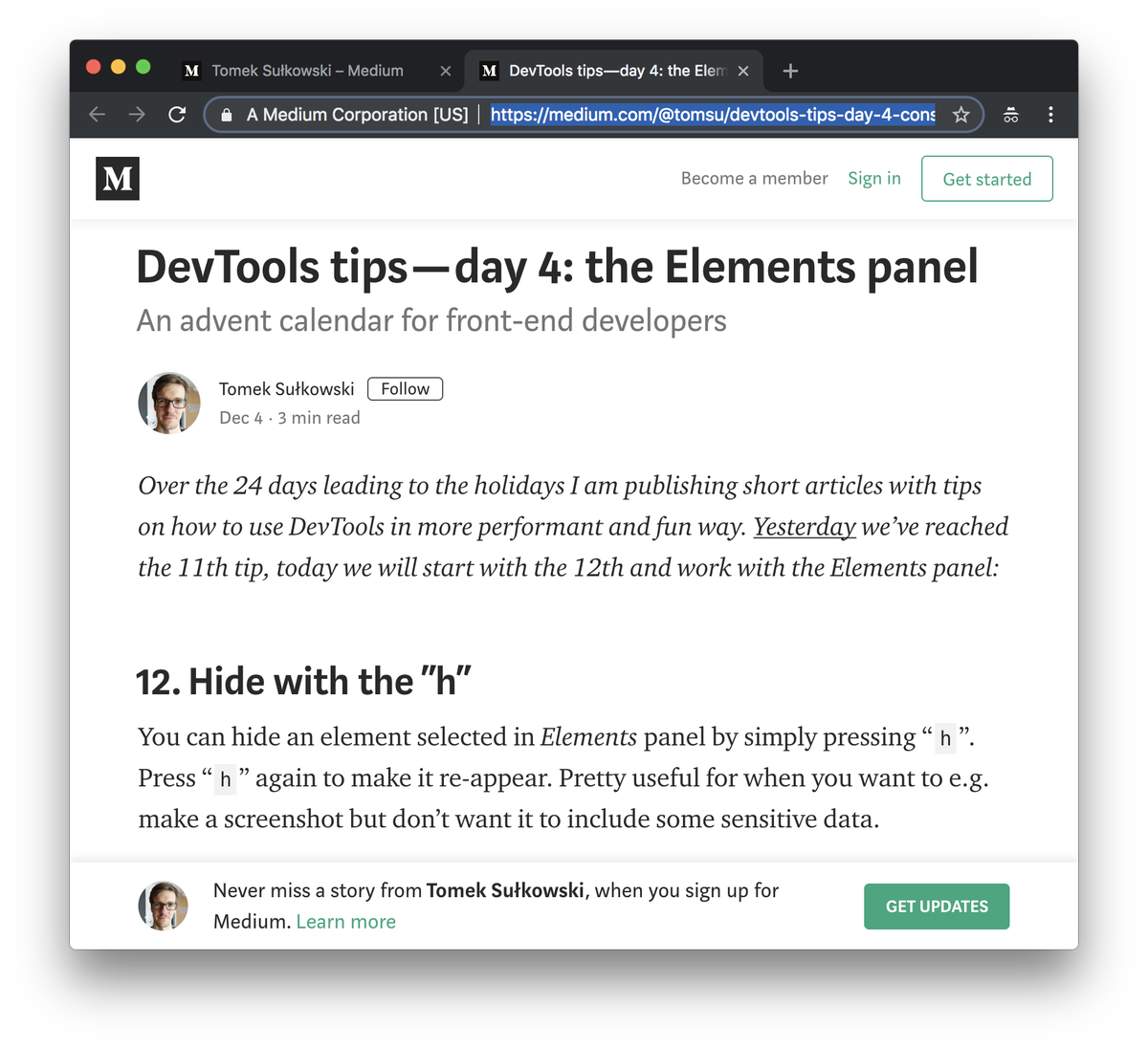 24 days of DevTools tips by @sulco Day 4: "The Elements Panel" https://medium.com/@tomsu/devtools-tips-day-4-console-methods-47c854782cef …pic.twitter.com/d1aW3x7uFa