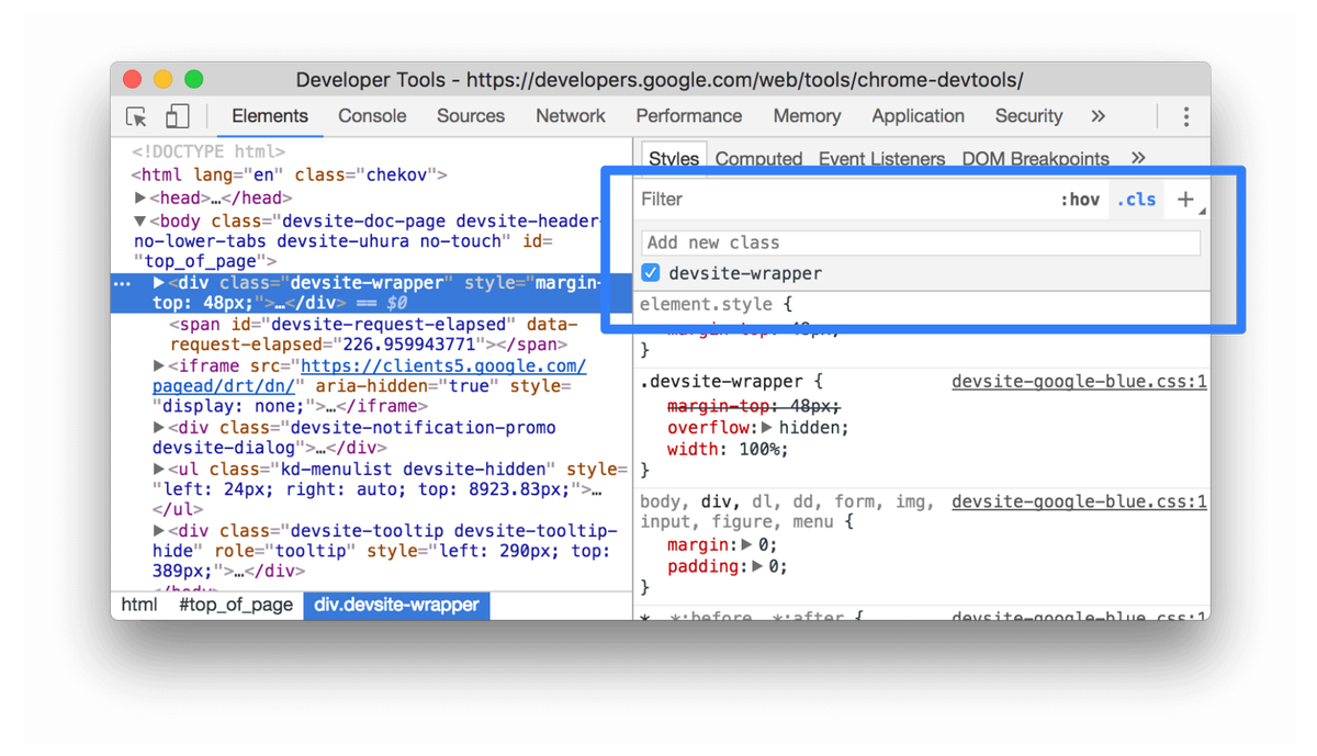 @ChromeDevTools Idea/feature request: A Classes panel/tab, like Styles, where you can add/remove/edit and switch individual classes on/off without editing html attribute in Elements. The latter is especially useful when you're working with modifier classes.