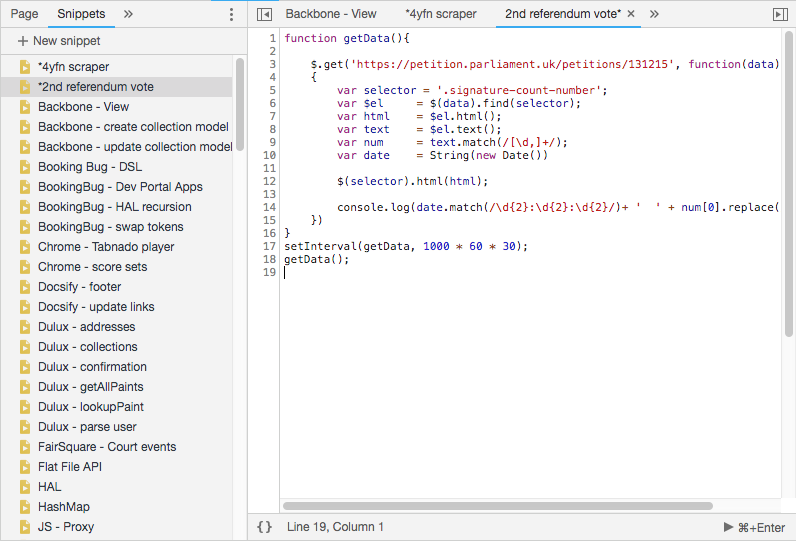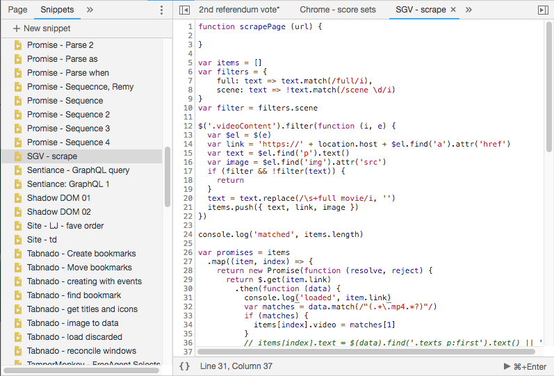 Any @ChromeDevTools Snippets fans out there!? I use them for all sorts of things, from spikes, to DOM manipulation, to scraping. If you have time and membership, please add a star to this feature request for better snippets file management. Thanks! https://bugs.chromium.org/p/chromium/issues/detail?id=944630 …pic.twitter.com/dcBW1R95k1