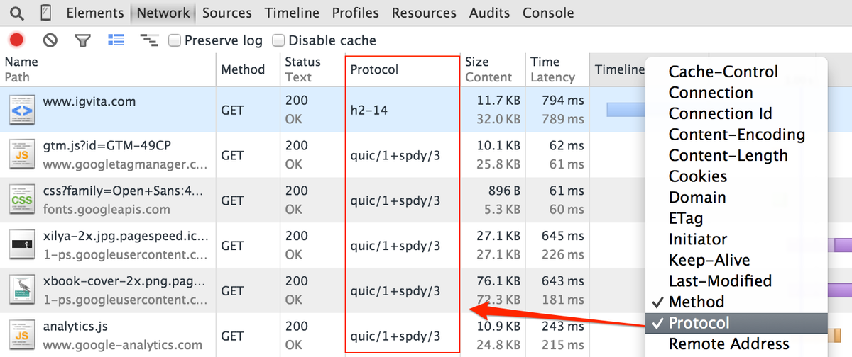 just landed: "protocol" column in Canary DevTools! to enable: open net panel, right click on column headers...pic.twitter.com/XG9EAbu0q6