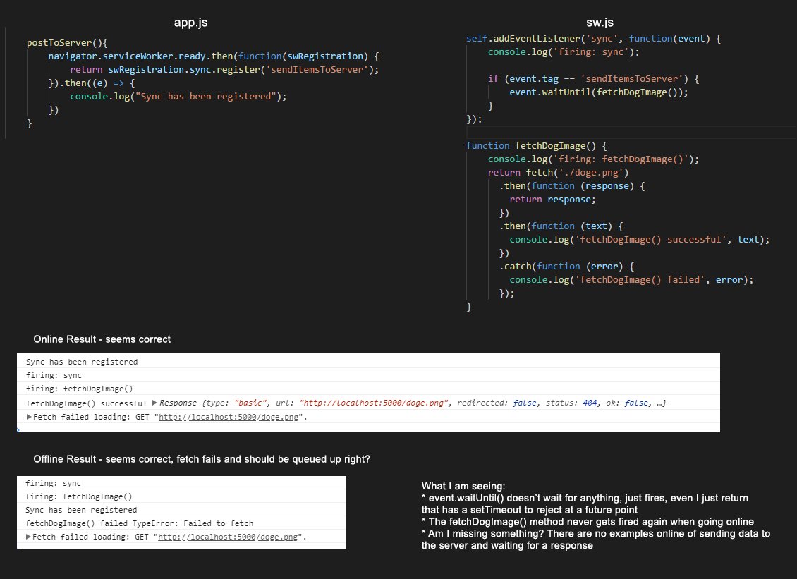 Morning all, "So SW will never get bg-sync event while offline". I can reproduce the issue just by opening DevTools and ticking the offline button, the SW will *always* get the bg-sync event. If I go truly offline with Airplane mode, then the bg-sync event is delayed until online