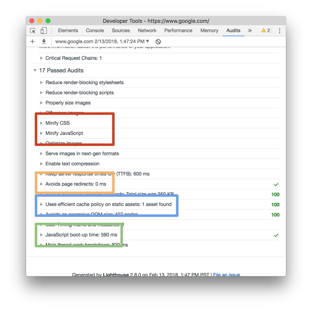 New performance audits in Chrome 65. The colors represent nothing, other than my inability to create attractive color palettes. --- Kaycepic.twitter.com/Qg3BBNdN4A