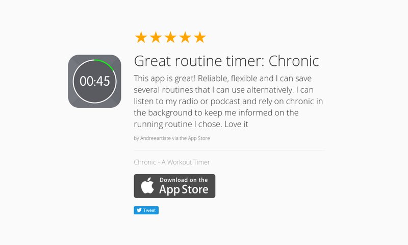 5 Star Review: "Great routine timer: Chronic: This app is great! Reliable, flexible and I…" https://launchkit.io/reviews/XRtb4uE3S4g/ …pic.twitter.com/gU8Jk8UtAg