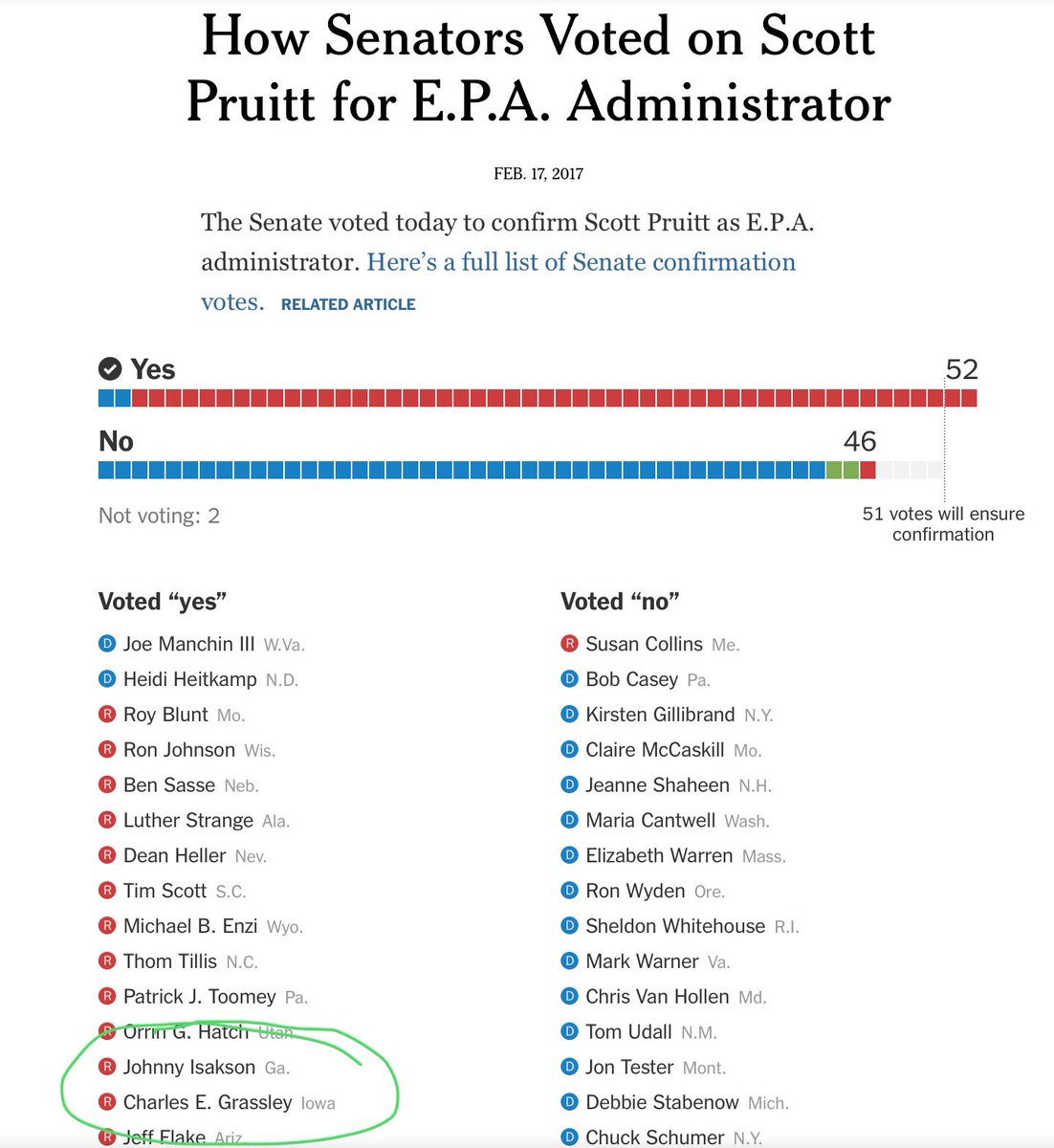 YOU voted to confirm Pruitt even after you were told that he was corrupt and not to be trusted. Now, you're suffering the consequences of your ignorance and blind devotion to Dictator Trump. The death of ethanol is your fault, Senator. Iowa farmers will be hurt because of you.