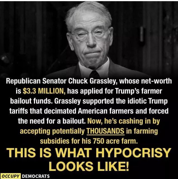 In the words of conservatives why should I have to pay for your poor choices????? Welfare King Grassleyhttps://hillreporter.com/millionaire-republican-senator-chuck-grassley-to-apply-for-trumps-farmer-bailout-money-8877 …