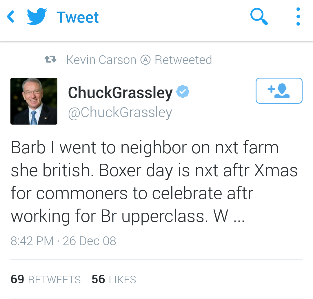 @ChuckGrassley Boxing Day is when the British Aristocracy hands out (used to?) beautifully made boxes to the Help and those in need.Thanks. Twitter will use this to make your timeline better. UndoUndo