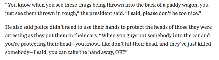 Trump urges law enforcement officers not to be “too nice” to those they’re arresting. Full quote: https://www.wsj.com/articles/trump-to-group-of-law-enforcement-officers-please-dont-be-too-nice-1501273200 …pic.twitter.com/jxzwfSWLEu