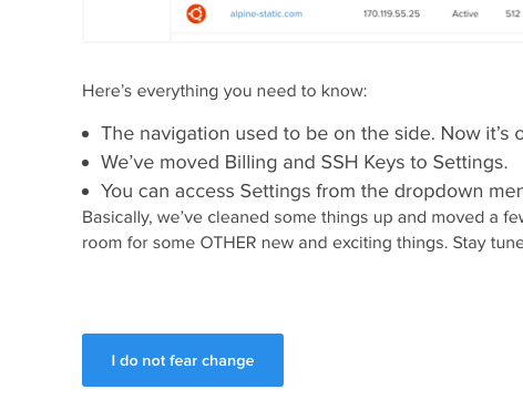 @digitalocean’s page announcing UI changes Best. Button label. Ever. Note that it’s also the *only* button :)pic.twitter.com/19tOhJTrH7
