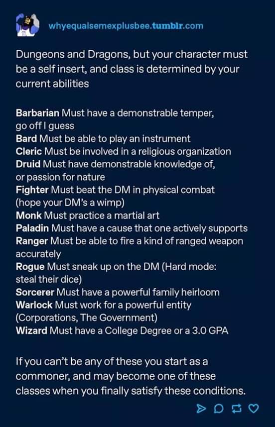 I am or would be a barbarian, novice bard, book druid, ex-claric, paladin, and novice wizard.pic.twitter.com/NhT9dpwSxQ