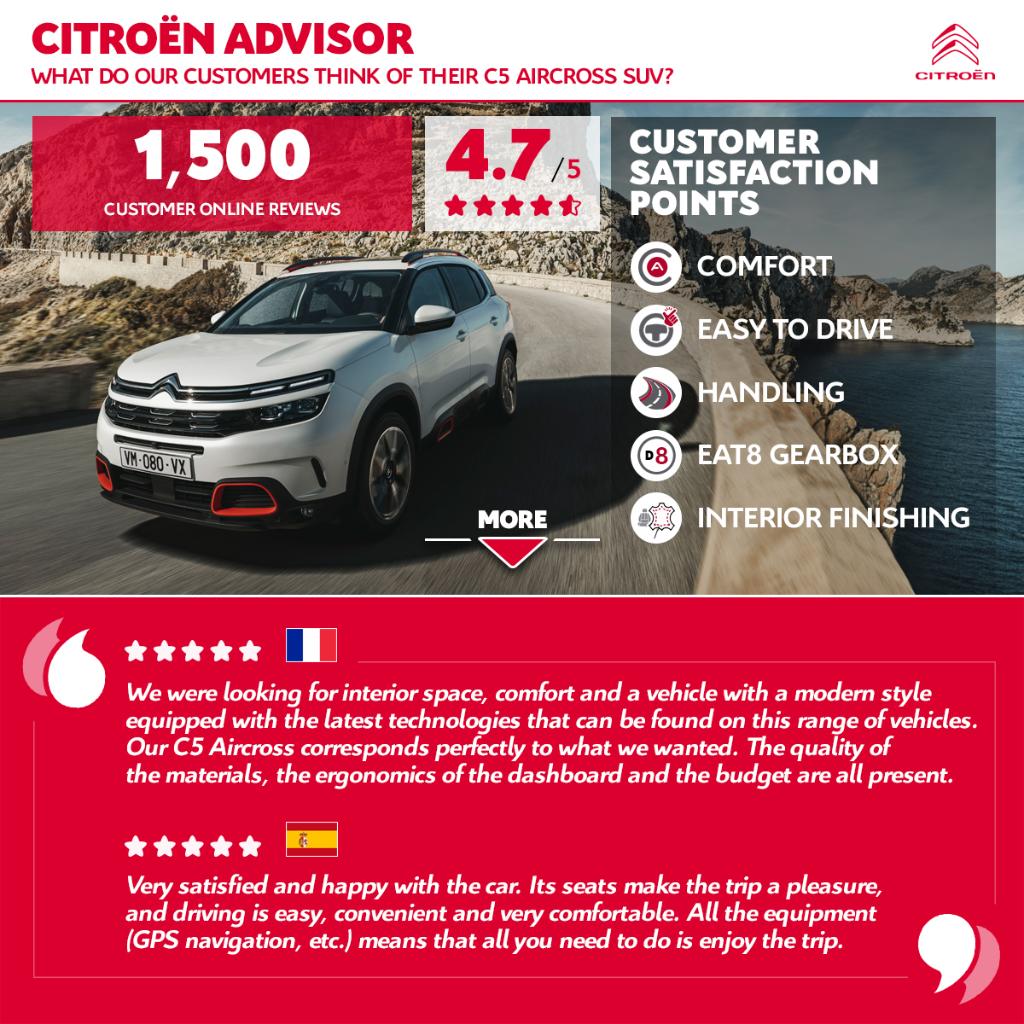 , C5 Aircross SUV is one of the Citroën models best rated by its customers on Citroën Advisor. Its comfort, ease of driving and practicality stand out among the satisfaction points expressed by customers #CitroënDataFactspic.twitter.com/ToGbk1qDb7