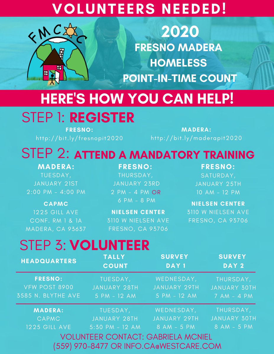 #Fresno#Madera Homeless PIT Count continues this week with 3 training opportunities in Fresno with 2 happening tomorrow, 1/23. All volunteers must attend a training! Please see below for all info.#PIT2020 Fresno Registration: http://bit.ly/fresnopit2020 pic.twitter.com/fnDI4JvWNt