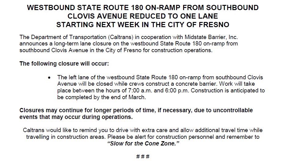 CITY OF FRESNO: The left lane of the westbound SR-180 on-ramp from southbound Clovis Ave will be closed daily from 7am to 6pm starting Monday, February, 3 while construction crews work in the area. Please be sure to seek alternate routes or allow extra time for your commute.pic.twitter.com/IAfgE8Rg8r
