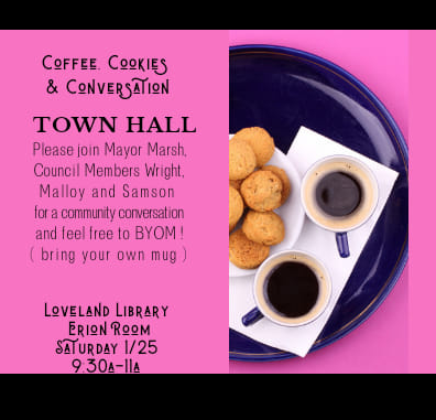You're invited to join Mayor Marsh and City Councilors Molloy, Samson and Wright, for Cookies, Coffee & Conversation. Time: 9:30 a.m. Date: Sat., Jan. 25 Location: Gertrude Scott room, Loveland Public Library Hope to see you there!