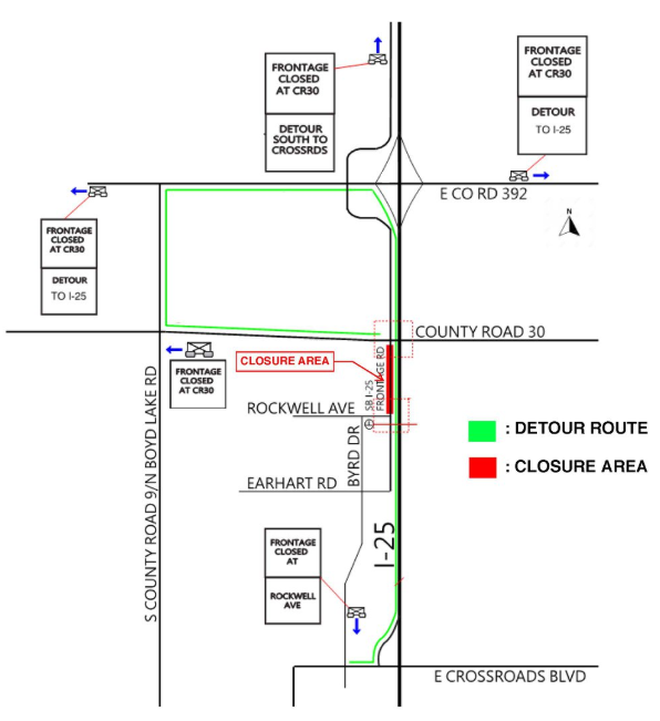 Closure of SW Frontage Rd. from E Cty. Rd 30 to Rockwell Ave. begins Mon., Feb. 3. Traffic will detour west on ECR 30 to Cnty. Rd. 9 to CO 392. Take CO 392 to SB I-25 and exit onto Crossroads Blvd. Turn right onto Byrd Dr. - continue to the SW Frontage Rd.