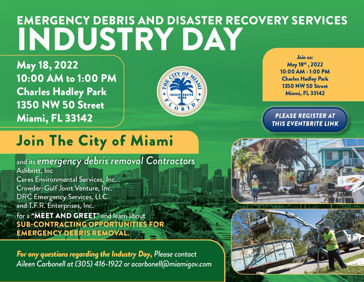 Are you interested in learning about subcontracting opportunities for emergency debris removal services or know someone who might be? Come join us on our next "meet and greet"next week at Hadley Park from 10:00 a.m. to 1:00 p.m!pic.twitter.com/8ZwHhsQnAy