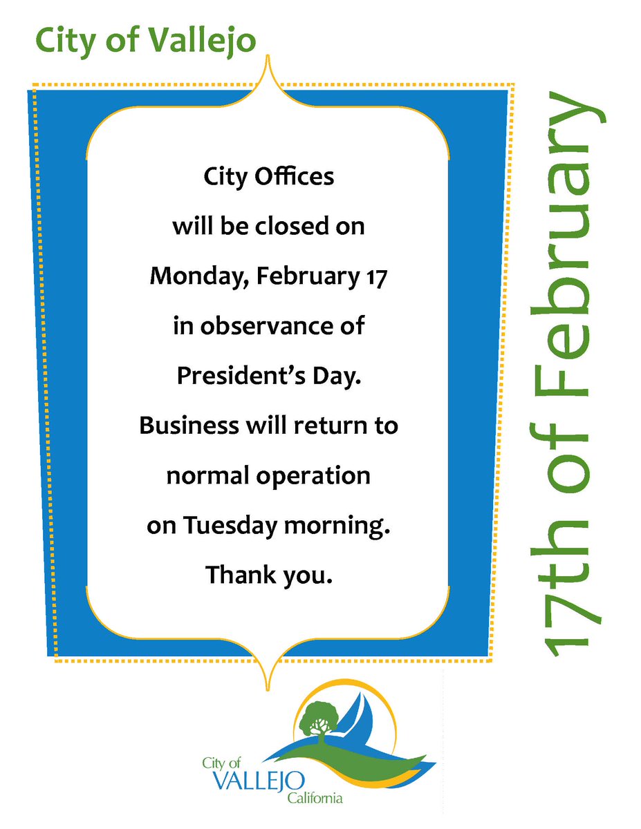 City Offices will be closed on Monday, February 17, in observance of President's Day.