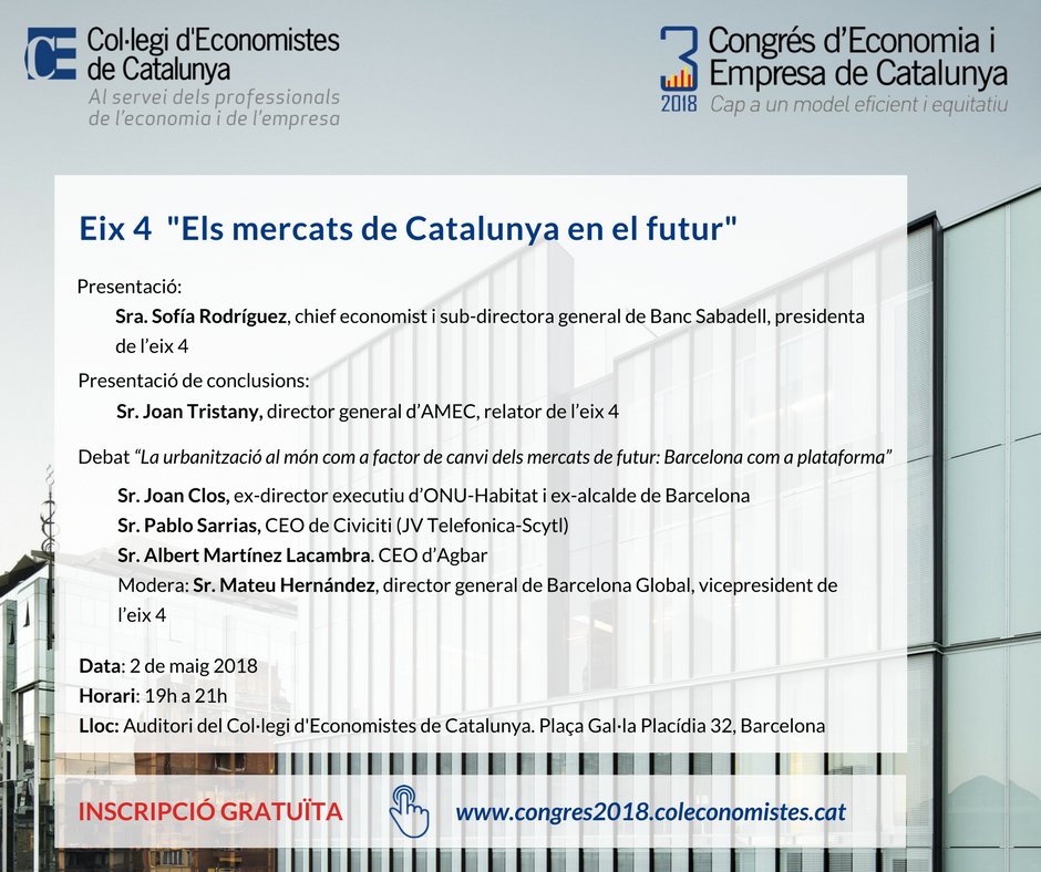 El 02/05 19H Eix 4 del #3rCongresEconomiaEmpresaCEC sobre "Els mercats de Catalunya en el futur" amb Sofía Rodríguez @BancoSabadell, Joan Tristany #AMEC, @Joanclos, @pablo_sarrias @Civiciti, @albertmlacambra @Agbar i @MateuHernandez. Inscripció gratuïta