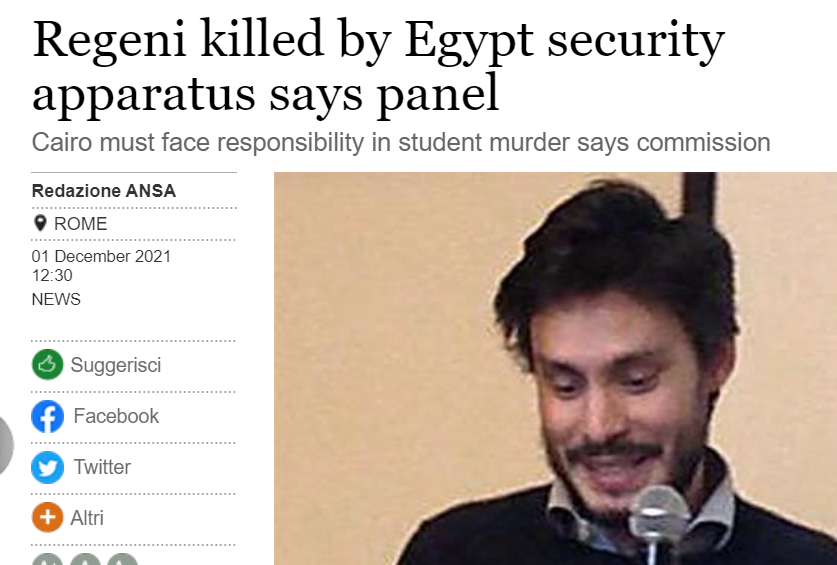 #Regeni killed by#Egypt's security apparatus, Italian parliament inquiry finds: https://www.ansa.it/english/news/general_news/2021/12/01/regeni-killed-by-egypt-security-apparatus-says-panel_0a54a50b-8975-49f2-aa3a-95ae237aaa07.html … But despite lack of judicial cooperation, deep human rights crisis, al-Sisi's govt continues to enjoy Italy's & Europe's unconditional military, political & economic support.pic.twitter.com/FPJRHnTCwM
