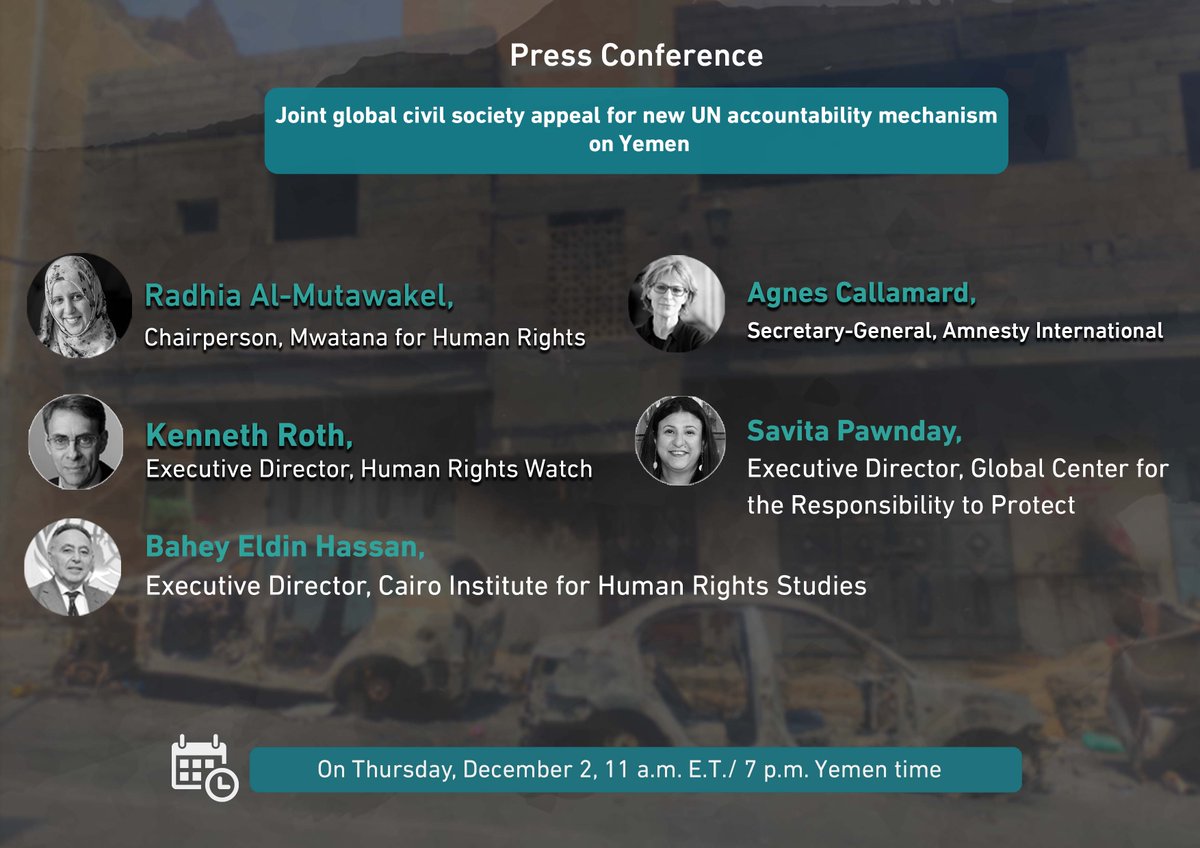 #UN accountability mechanism on#Yemen@hrw@amnesty@MwatanaEn@CIHRS_Alerts &@GCR2P are holding a press conference today at 11am ET/ 7pm Yemen time/ 5pm CET. Watch live: https://www.facebook.com/events/1557204357978327 …#AccountabilityNow#YemenCantWaitpic.twitter.com/w4vPP9Zlme