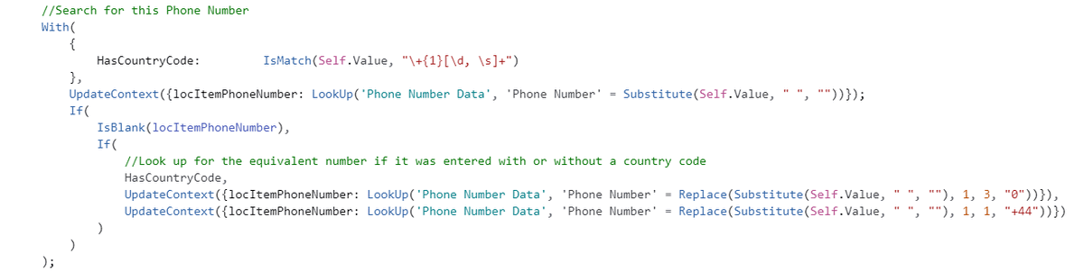 #RegEx with#IsMatch in#PowerApps, I made a search field for Phone Numbers that will return a match regardless of if the number in the database or the search term includes a country code
