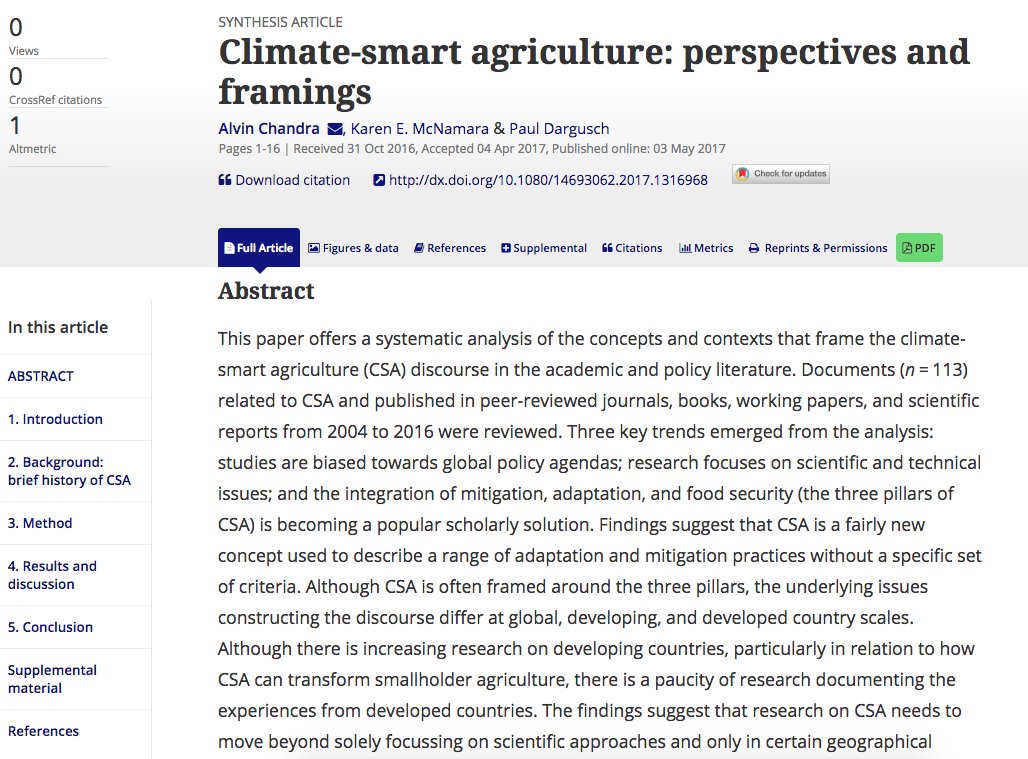 Climate-smart agriculture has ample scientific grounding, but studies have neglected its socio-political dimensions. http://www.tandfonline.com/doi/full/10.1080/14693062.2017.1316968 …pic.twitter.com/GITWae0o5c