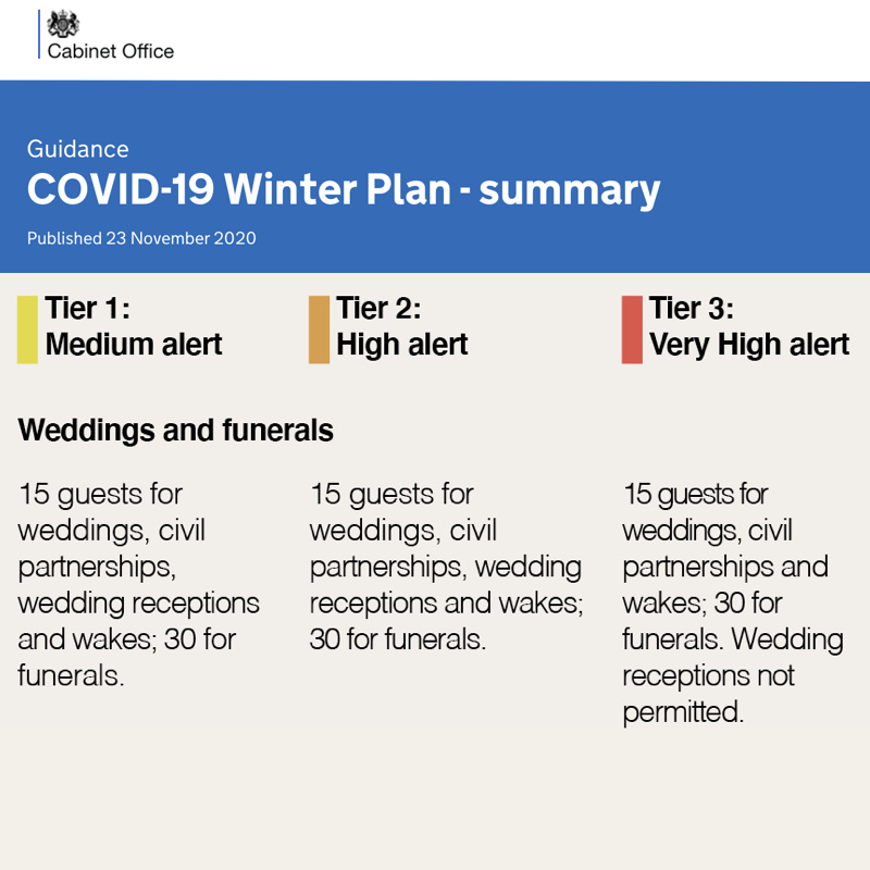 How many guests will be allowed at funerals and weddings under the new tiered regional system? https://bit.ly/3maCeA4 pic.twitter.com/Rf1oTBgij3