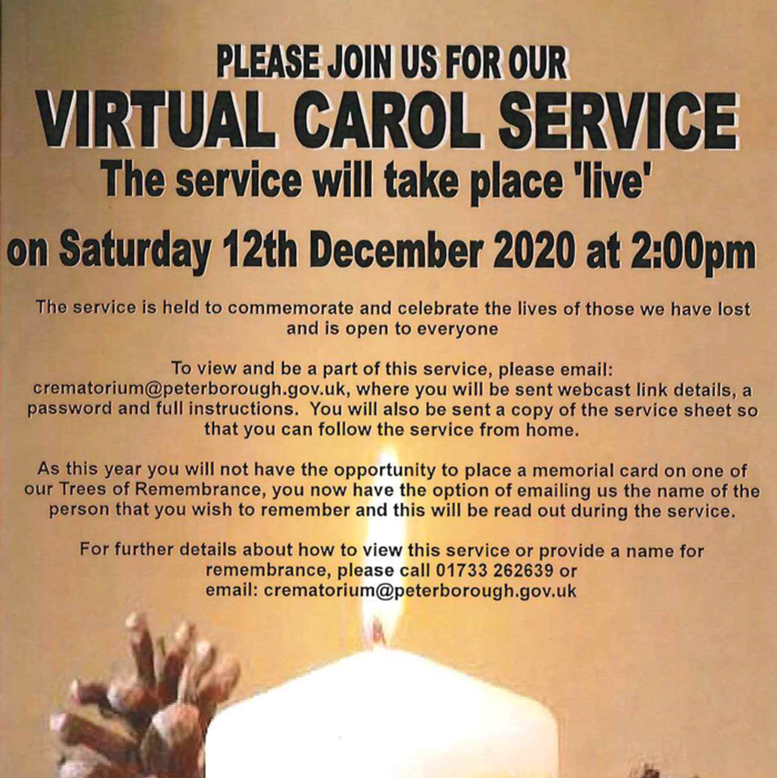 Peterborough Crematorium will be holding a virtual carol service on 12th December at 2pm to commemorate and celebrate those we have lost. Email crematorium@peterborough.gov.uk to take part via weblink.pic.twitter.com/qatHEJbVsn