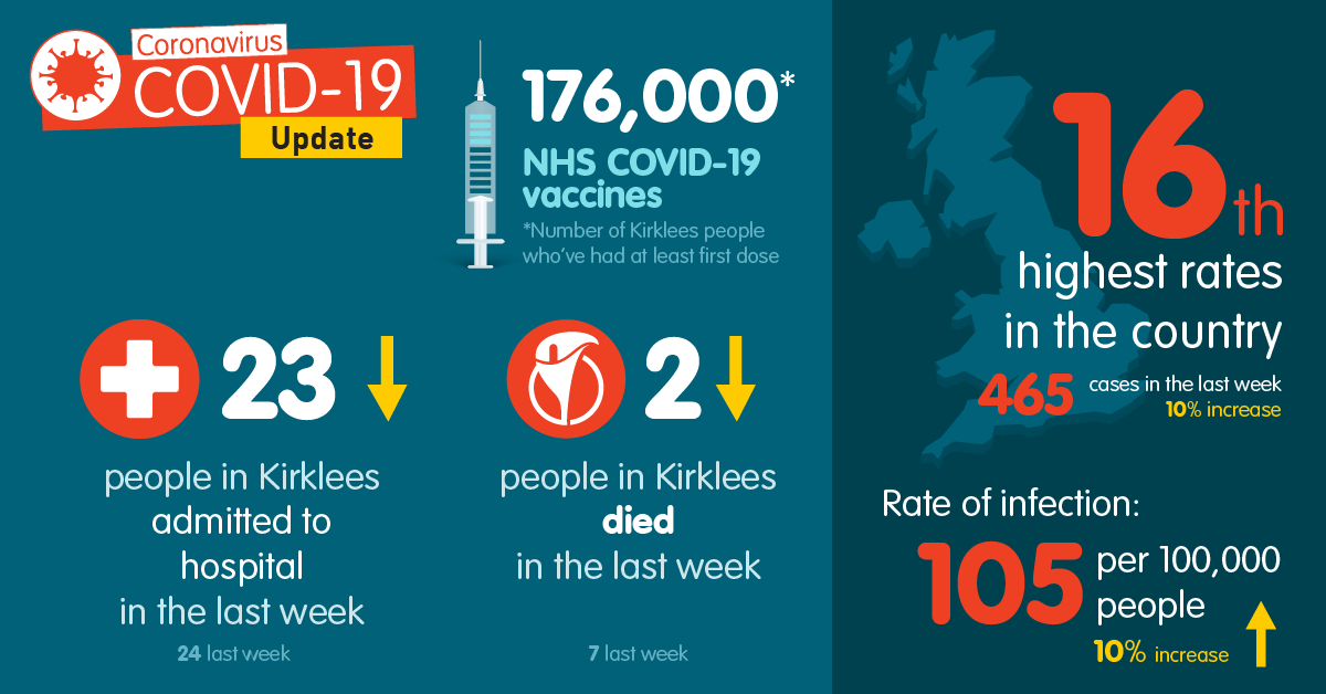 Hospitalisations and deaths related to Covid-19 are continuing to fall, but Kirklees’ infection rate has increased over the last week. With some restrictions set to ease on Monday (29 March), we’re urging everyone to remain cautious. http://orlo.uk/rdisX pic.twitter.com/K6zY6p9ncx
