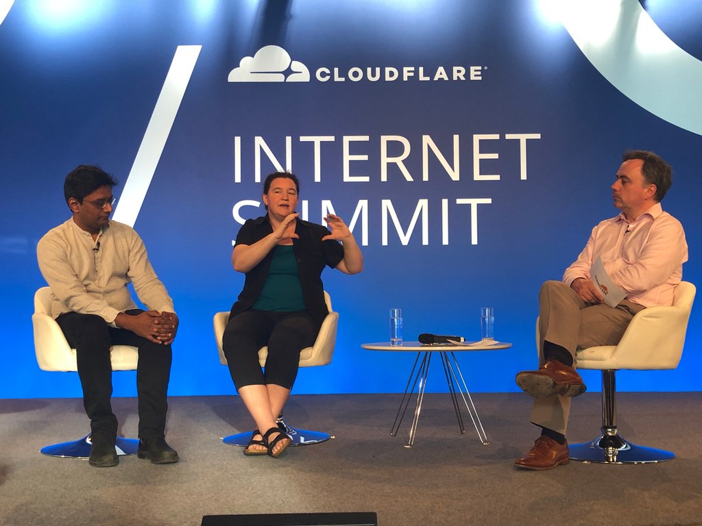 Up now we have @hyperelliptic and Karthik Bhargava discussing cryptography and security with @jgrahamc. #InternetSummitpic.twitter.com/YnLoiSBulB