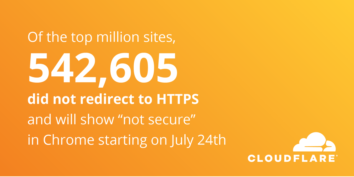 The majority of the Internet’s top 1M most popular sites will show up as “Not Secure” in @GoogleChrome starting July 24th. Make sure your site redirects to #HTTPS, so you don’t have the same problem. @Cloudflare makes it easy! #SecureOnChrome https://cfl.re/2LA4t9i  pic.twitter.com/r2HWkfRofW