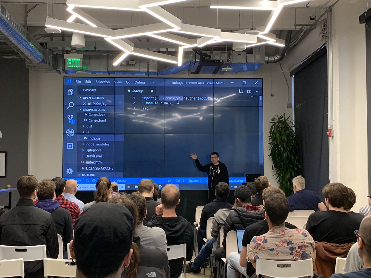 @steveklabnik doing a great job filling in for @ag_dubs to teach us about WASM, Rust, and a dash of @Cloudflare Workers at the SF WASM Meetup. pic.twitter.com/T3cWUF32ef