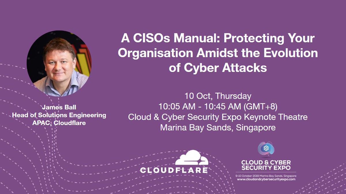 Join James Ball, Head of Solution Engineering for APAC at @Cloudflare, for his panel on “A CISOs Manual: Protecting Your Organisation Amidst the Evolution of Cyber Attacks” at Cloud & Cyber Security Expo 2019 in Singapore. Thur, Oct 10th,10:05-10:45AM SGT https://cfl.re/2ngjjuD pic.twitter.com/1QGZLmvGww