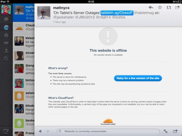 @CloudFlare tabletmag got fireballed, looks like you tried to save them but didn't quite. Bad luck with high traffic.pic.twitter.com/iTazuhG7