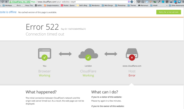 @CloudFlare Getting 'error 502/bad gateway' and 'retry for a live version' on your own site! Are you having problems?pic.twitter.com/A556xdytZK