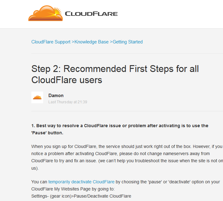 .@CloudFlare Recommended First Steps... deactivate CloudFlare... okayy - I know why but is that the best 1st message?pic.twitter.com/ZNGihRwm2Z