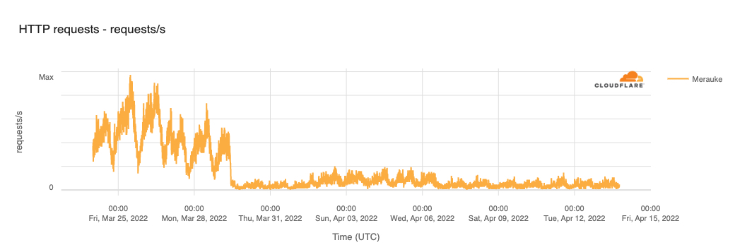 #Internet connectivity in Merauke City, Papua since Sunday, March 27, according to@TelkomIndonesia. The impact is visible in@Cloudflare traffic data for the city. https://twitter.com/SubTelForum/status/1514305979353116678 …pic.twitter.com/9DDqtm6ZiS