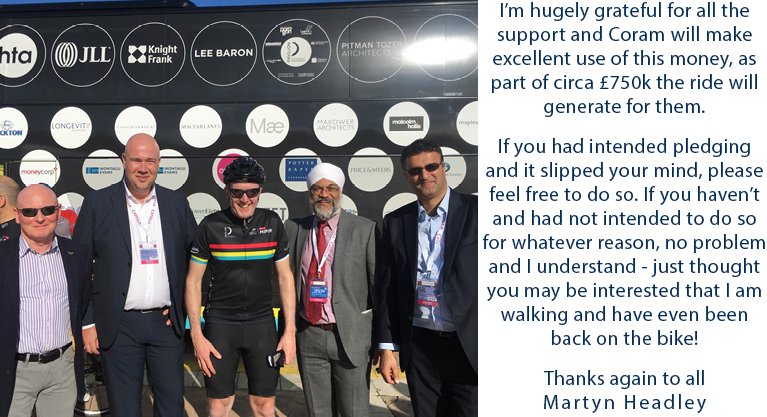 #CycletoMIPIM with the tougher moments erased from his memory,@HeadleyMartyn woud like to bring to a close his fundraising. Thus far, he has accumulated a huge £7.5K for@Coram & would like to send his thanks all..