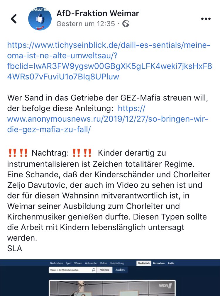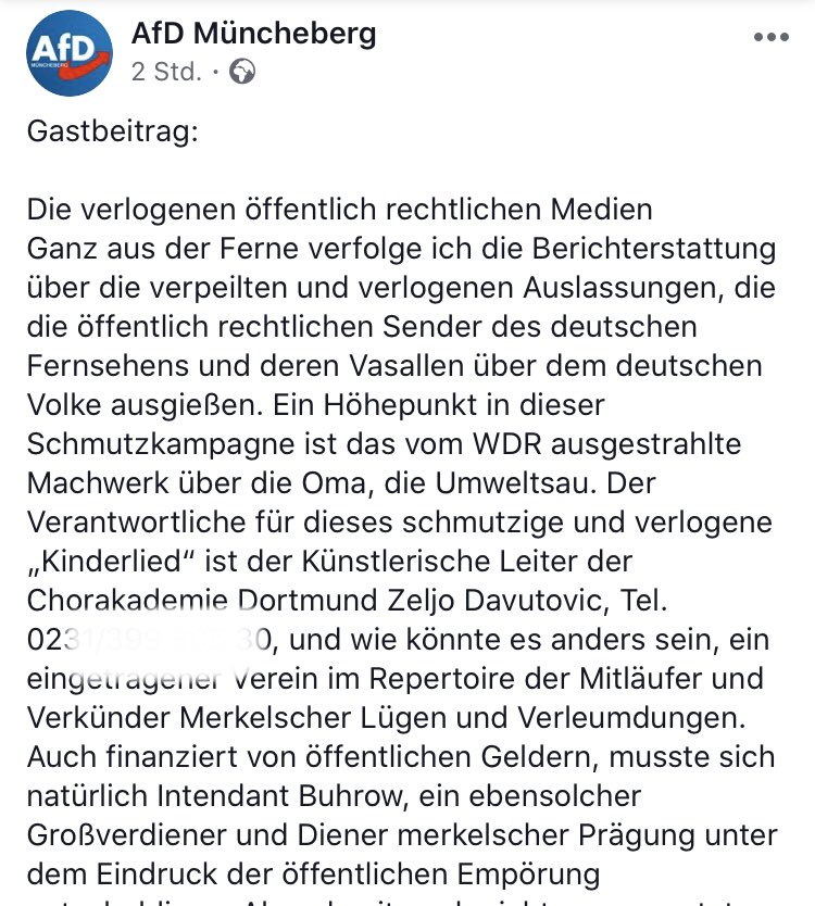 #AfD beleidigt Chorleiter als „Kinderschänder“, verbreitet Telefonnummer; Demonstranten singen „deutsche Oma über alles“; Neonazis tauchen vor Haus der Familie eines#WDR-Kollegen auf: Strategie der Einschüchterung - im Netz und auf der Straße.#Pressefreiheit#Umweltsaupic.twitter.com/zKOZr1YXqs