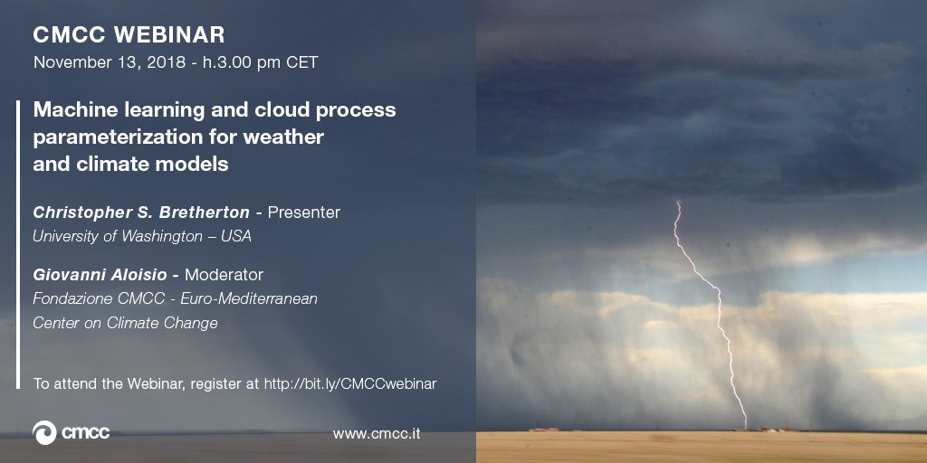 CMCC #Webinar 🌍 Nov 13 2018 h.3.00 pm CEST #Machine #learning and cloud process parameterization for #weather and #climate #models Presenter: Prof. C.S. Bretherton, Dept of Atmospheric Science and Applied Mathematics @UW Moderator: Giovanni Aloisio 👉http://ow.ly/m6C850jBVTR pic.twitter.com/8mO15fC9LY